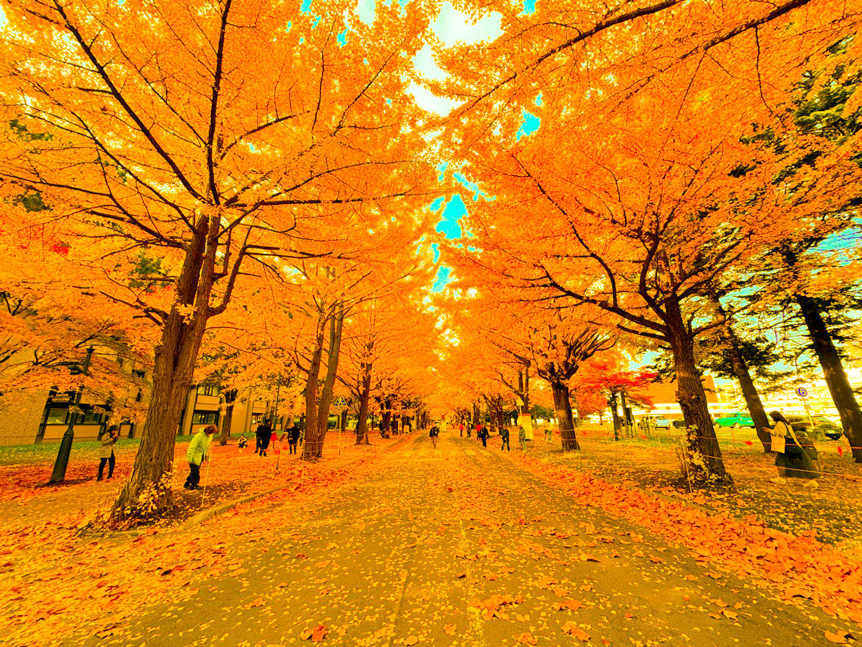 周りのビルと銀杏並木が並ぶ奥には、北海道庁が見えます。遠近感があるように、広角レンズで撮影された一枚。銀杏の黄色の染まり方が、半端ないです。